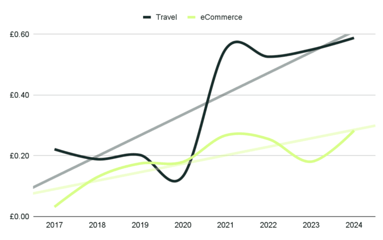 Unfortunately for our clients in travel, this is an industry that’s had an aggressive increase in CPCs. In particular, we saw a sharp increase after Covid which isn’t too surprising considering we were stuck at home for a while and then suddenly allowed to see the world. On average, we’ve seen CPCs increase in Travel by over 300% comparing 2024 to 2020.
